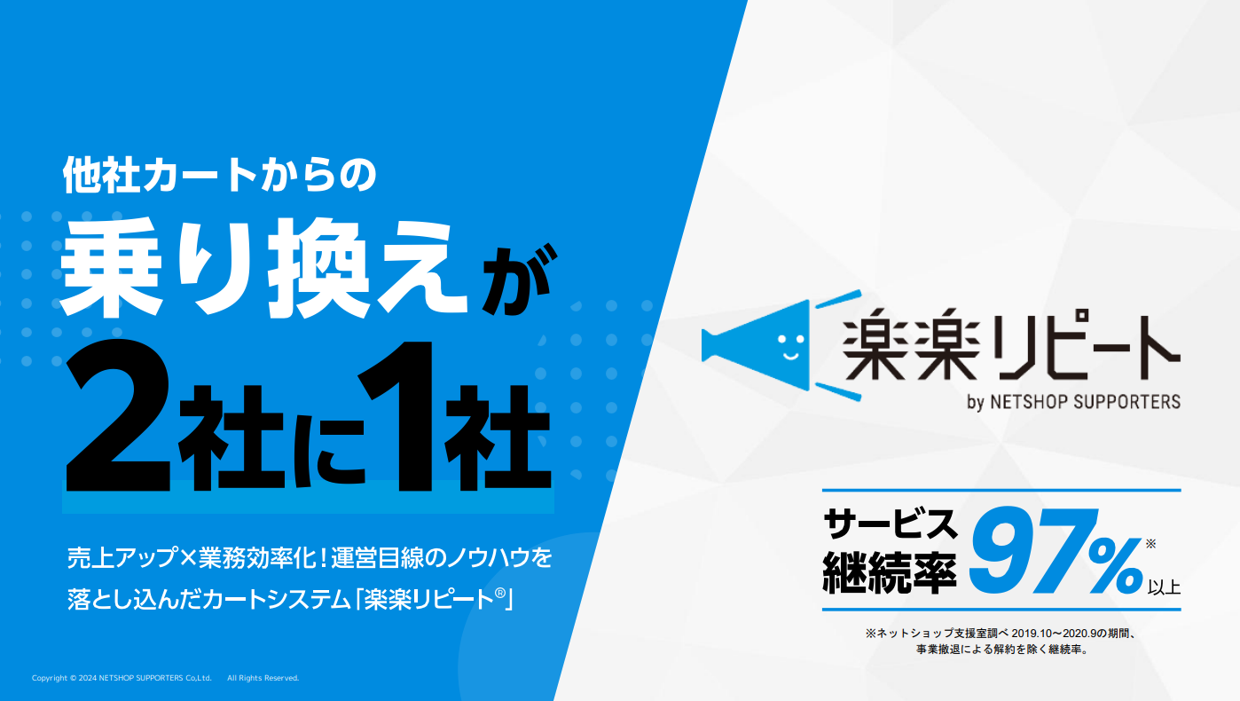 定期通販“超”特化型カートシステム「楽楽リピート」「楽楽リピート」の機能詳細や解決できる課題をご紹介しています。 ダウンロードする導入検討に必須な基本資料2点がまとめてダウンロードできます。 ダウンロードするD2C事業社必見!LTV最大化のためのパーソナライズ活用とは? 本資料ではパーソナライズの概要から活用方法まで解説しています。 ダウンロードする"定期通販立ち上げに必見"事業者目線での選定は危険!!ファンマーケティングの重要性 選ぶべきカートシステムは、ECサイトのニーズに合った充実した機能を提供していることが重要です。立上げを考えている方は是非、本資料をご活用くださいませ。 ダウンロードする【2023年最新版】カートシステムの選定ポイントと機能・料金比較表 本資料ではパーソナライズの概要から活用方法まで解説しています。 ダウンロードする“売上拡大に必要なこと”とは?D2C-EC成功事例集~EC事業難化の時代でも成長し続ける企業6社を紹介~ 楽楽リピート導入企業の成功事例を紹介しています ダウンロードする"CPA高騰している今だからこそ実施すべき"定期通販における友人紹介制度の活用方法 選ぶべきカートシステムは、ECサイトのニーズに合った充実した機能を提供していることが重要です。立上げを考えている方は是非、本資料をご活用くださいませ。 ダウンロードする"目先の見積りには騙されない"システムリプレイスにおける定期通販カートシステムの移行準備と選定方法 選ぶべきカートシステムは、ECサイトのニーズに合った充実した機能を提供していることが重要です。リプレイスを考えている方は是非、本資料をご活用くださいませ。 ダウンロードするUAサポート終了まで約半年!UAをGA4でどこまで再現できるのか!?~GA活用術~勉強会開催レポート 本資料ではGA4の概要やUA版との違い、活用方法などについてご紹介しています ダウンロードする新CPM分析機能についてのご紹介と活用方法などを紹介しています ダウンロードする本資料ではパーソナライズの概要から活用方法まで解説しています。 ダウンロードする【セミナーレポート】~弁護士とカートのプロが質問に回答!~D2C×特商法改正対応セミナー 本資料は、2022年4月27日、5月25日に開催された【D2C×特商法改正対応セミナー】をレポート化したものです。 ダウンロードする【D2Cメーカー様必見!】自社ECサイトの始め方~失敗しないための7ステップとは?~ 本資料は、改正特定商取引法のうち、通信販売に関して新設される規定について解説しています。 ダウンロードする【2022年6月施行】改正特定商取引法~知らないと行政処分の可能性も!?~定期通販でおさえるべき4項目 本資料は、改正特定商取引法のうち、通信販売に関して新設される規定について解説しています。 ダウンロードする本資料では、顧客育成を目的とした封入物施策を具体的に紹介しています。 ダウンロードする本資料では、顧客育成を目的とした封入物施策を具体的に紹介しています。 ダウンロードする【永久保存版】サブスクECの立ち上げに超役立つ!